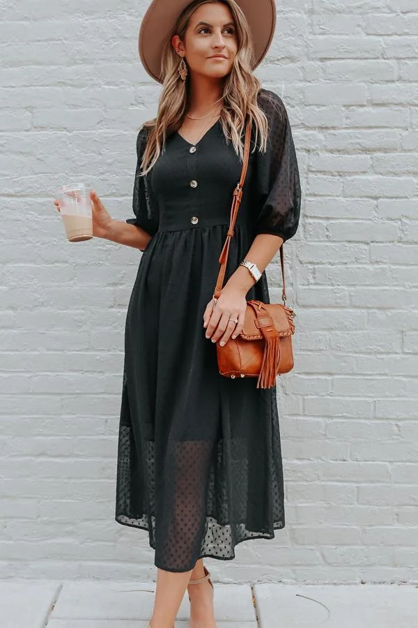 - Solid Color V Neck Lantern Sleeve Dress